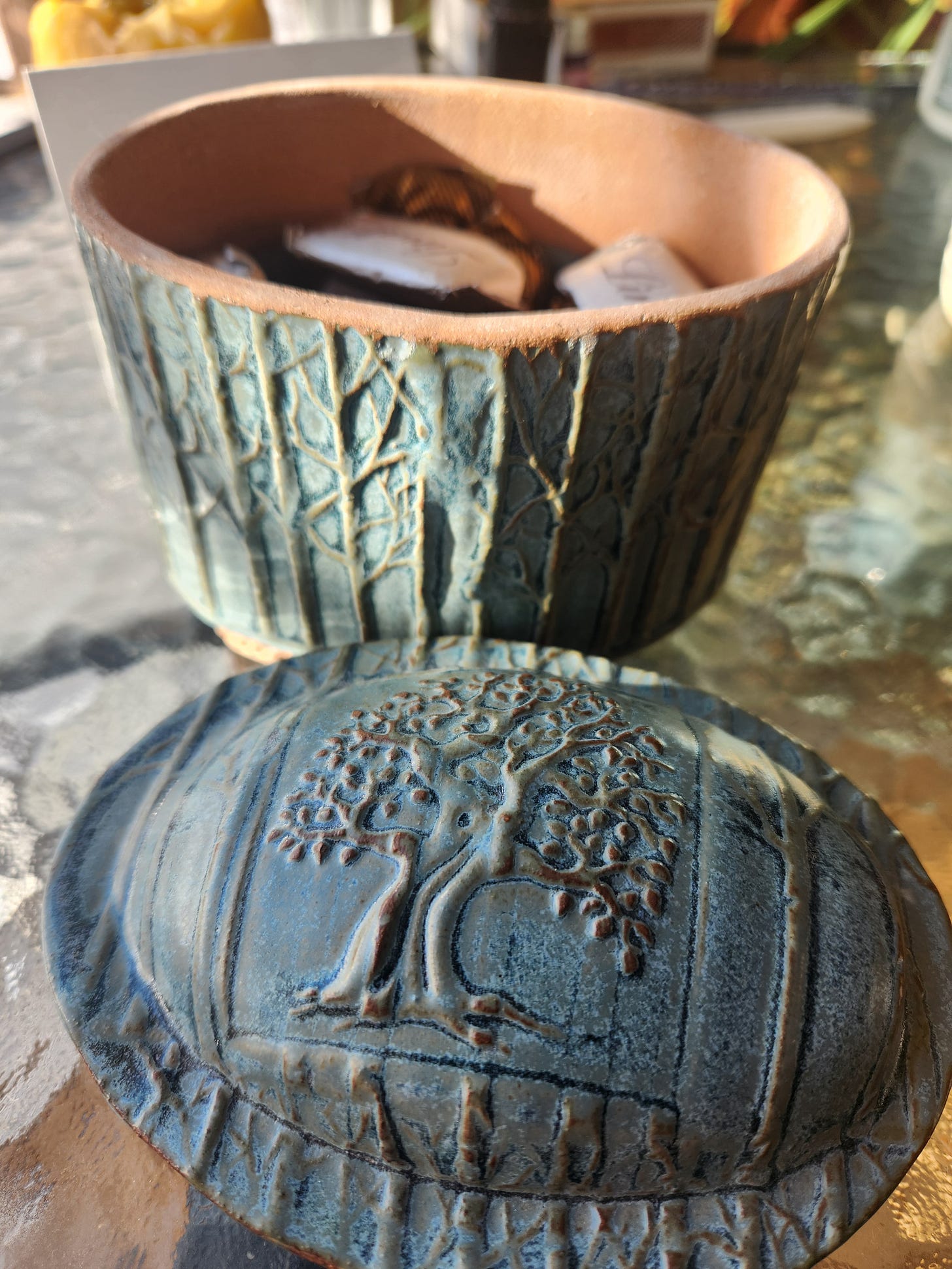 Today, the first thing I spotted was this beautiful, small blue, tree-carved vessel, with bare pottery feet and a lid featuring a gorgeous tree in relief. “A tree of life,” I whispered.