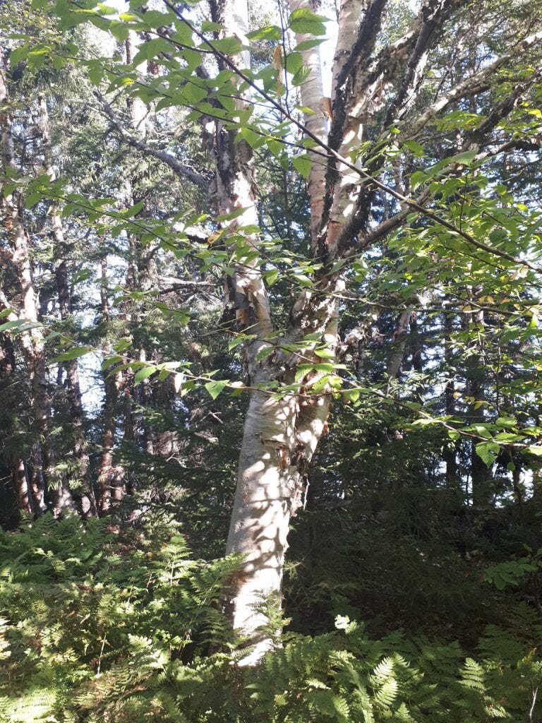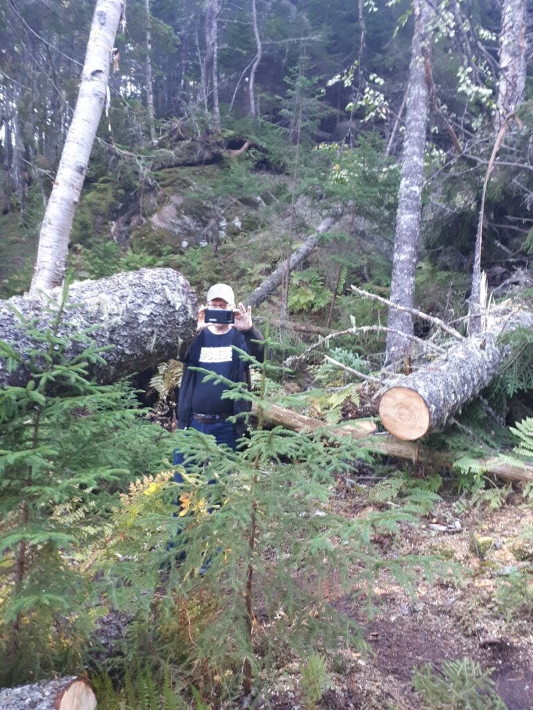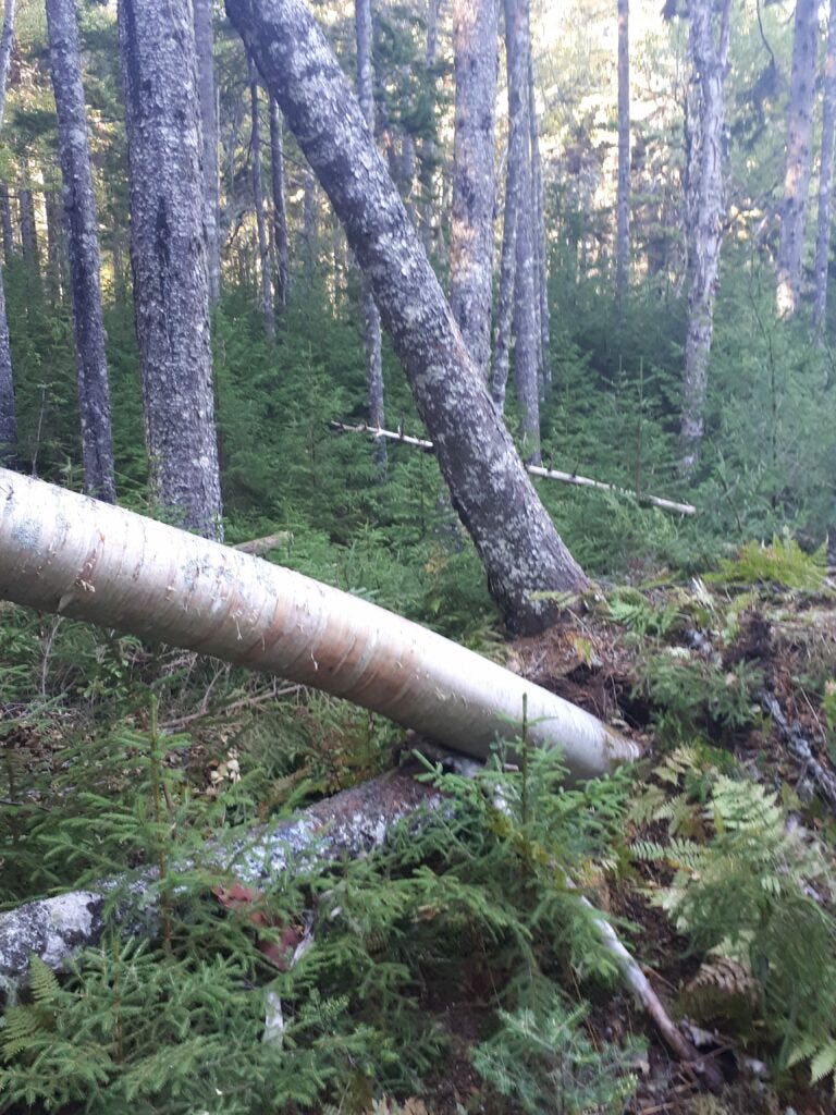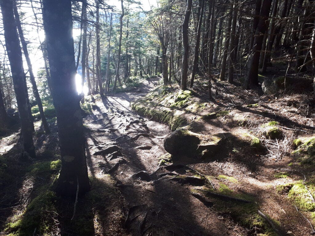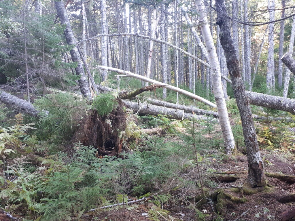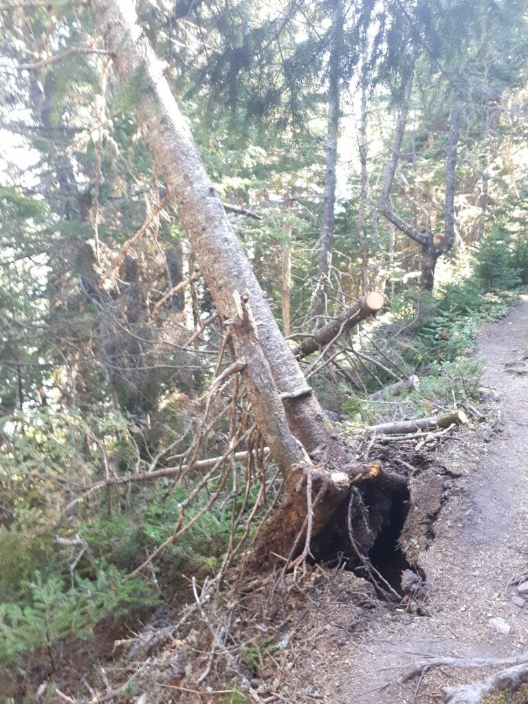 Hurricane Dorian made its mark this year. Many trees along the path, which at one time stood tall and resolute are broken or fallen, hanging on only by the network of roots in the mossy earth. The path squishes and creaks under my weight like an old mattress. Is it safe? Will the roots hold?