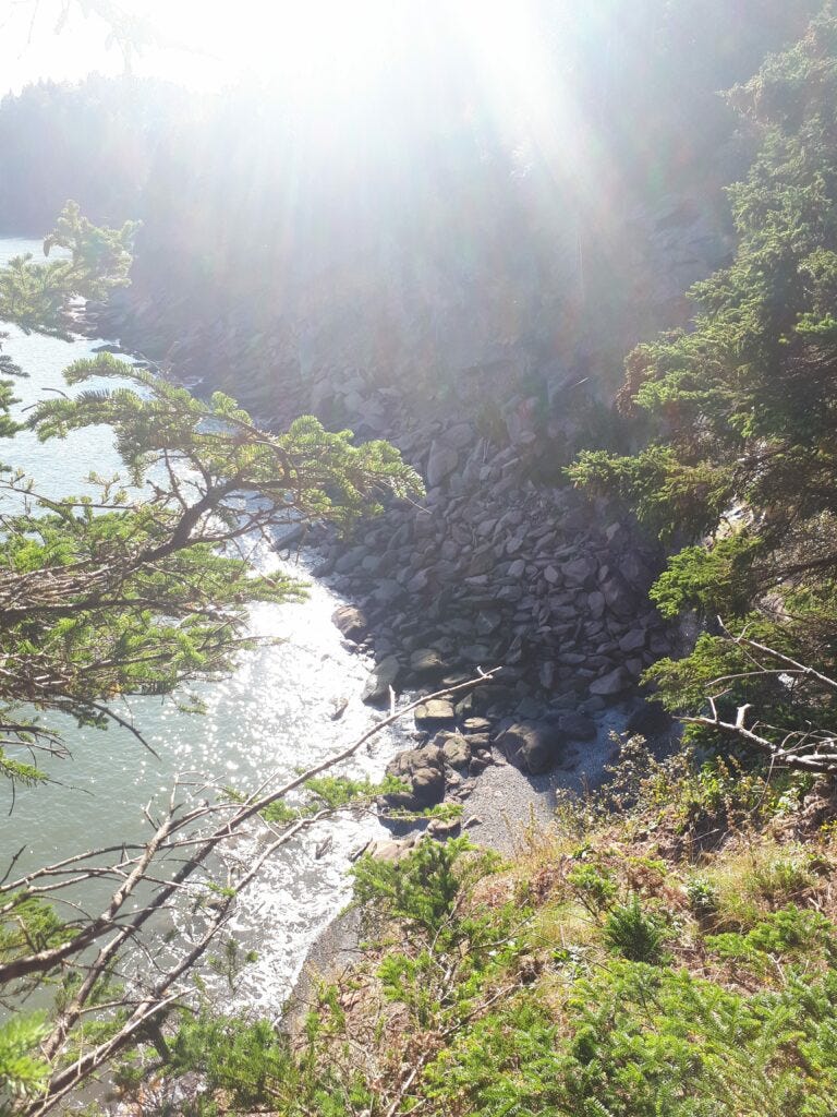 And along the way, it hasn't all been hard work. The landscape and the tides provide familiar sights and sounds: the dappled light among the ferns and birches, the crash of the waves breaking against the rocky cliffs, the sough of the breeze through the spruce trees, and the chitter of squirrels and birdsong.