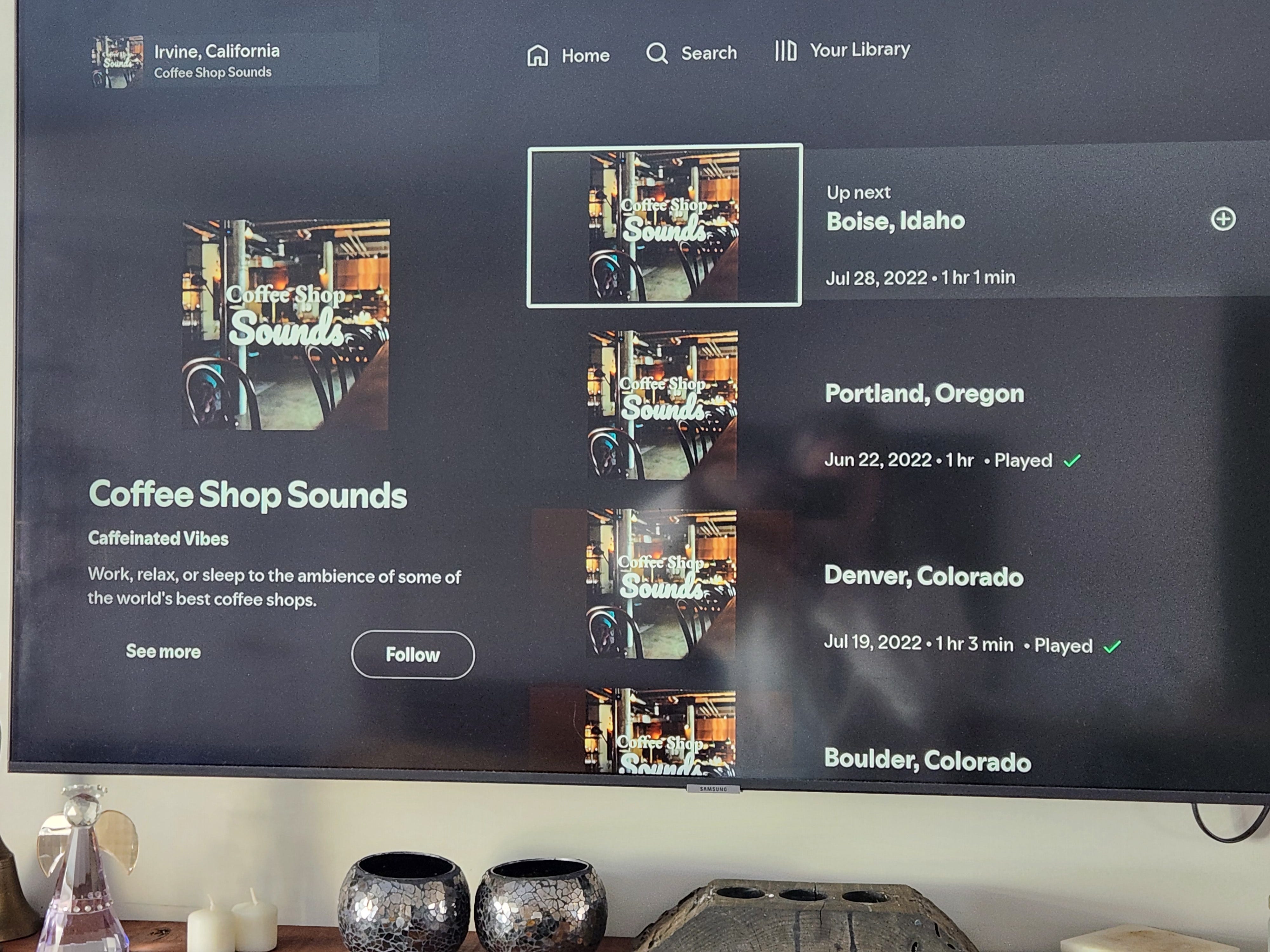 And on Spotify, he found some café sounds to play in the living room. I’m such a luddite that the availability of café noise surprised me.